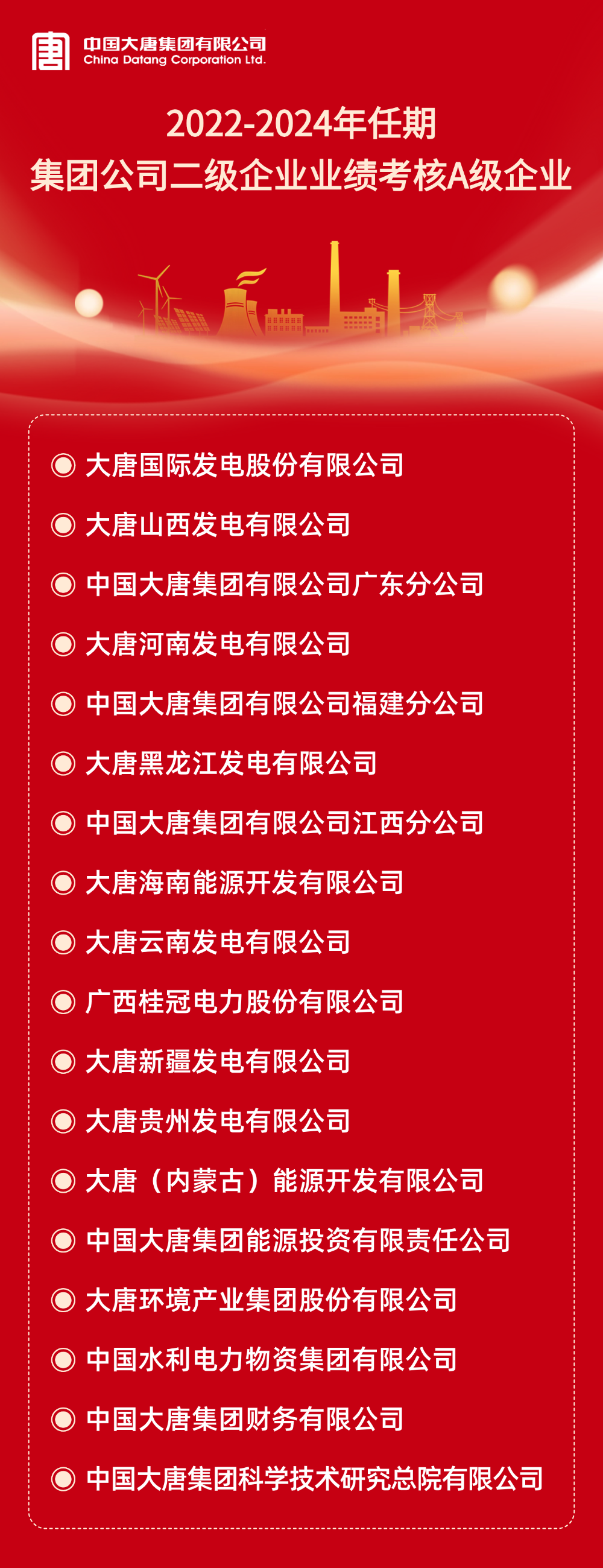 本網(wǎng)訊 根據(jù)《中國(guó)大唐集團(tuán)有限公司所屬企業(yè)年度業(yè)績(jī)考核辦法》和《中國(guó)大唐集團(tuán)有限公司所屬企業(yè)任期業(yè)績(jī)考核管理辦法(試行)》及有關(guān)規(guī)定,2024年度及2022-2024年任期二級(jí)企業(yè)業(yè)績(jī)考核結(jié)果已經(jīng)集團(tuán)公司董事長(zhǎng)專題會(huì)審議通過(guò)。A級(jí)企業(yè)名單如下:
