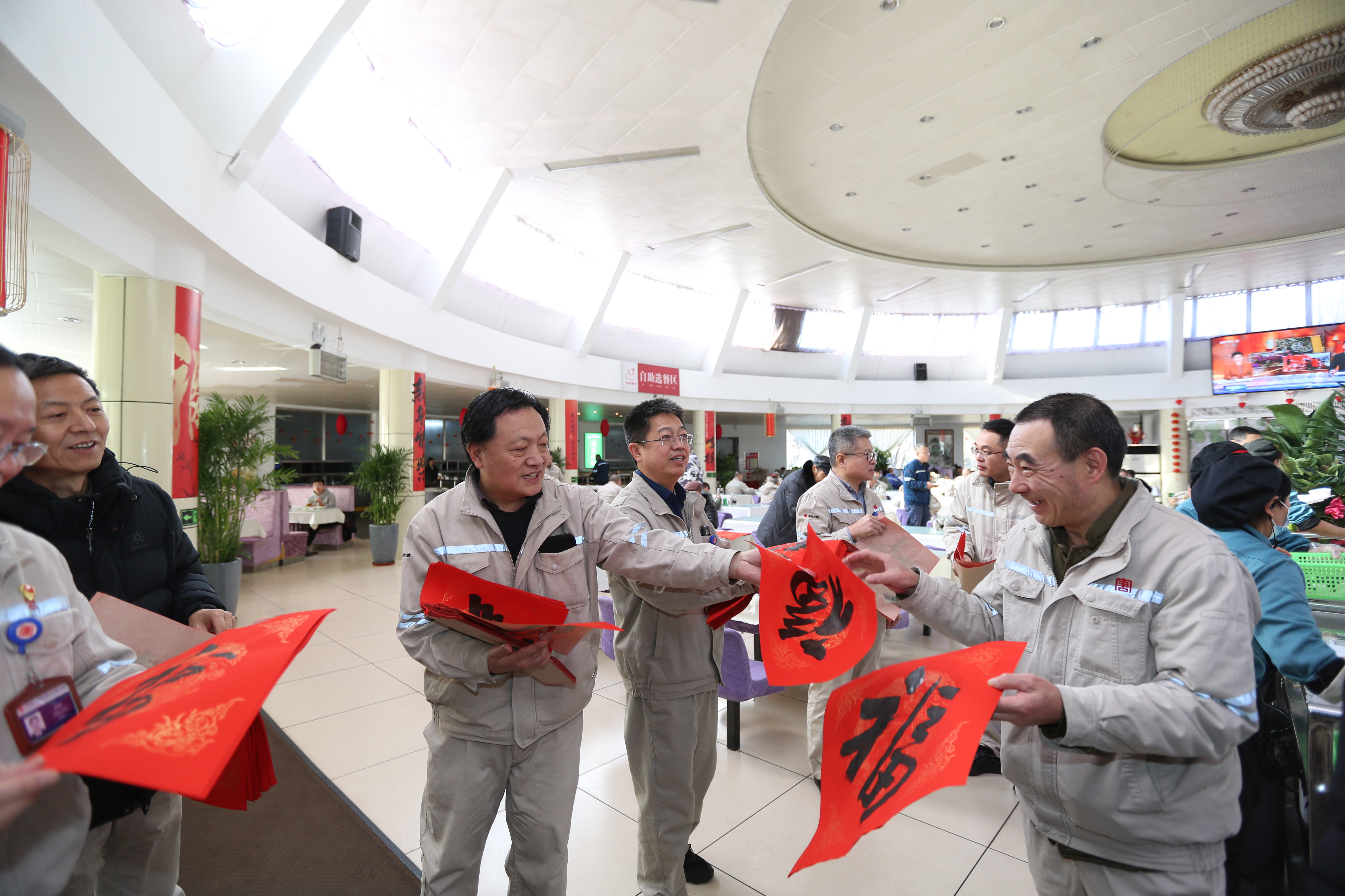 職工餐廳里,一場別開生面的送福字活動在新春的序曲中溫馨啟幕,活動現場,書法協會書法愛好者們齊聚一堂,紅氈鋪展,墨香縈繞,只見他們筆走龍蛇,力透紙背。一個個“?!弊?,或飄逸靈動,如行云流水;或剛勁有力,似蒼松挺立,每一筆,都飽含著對新年的美好祈愿。前來領取福字的員工們,眼中滿是對新年的欣喜與期待。