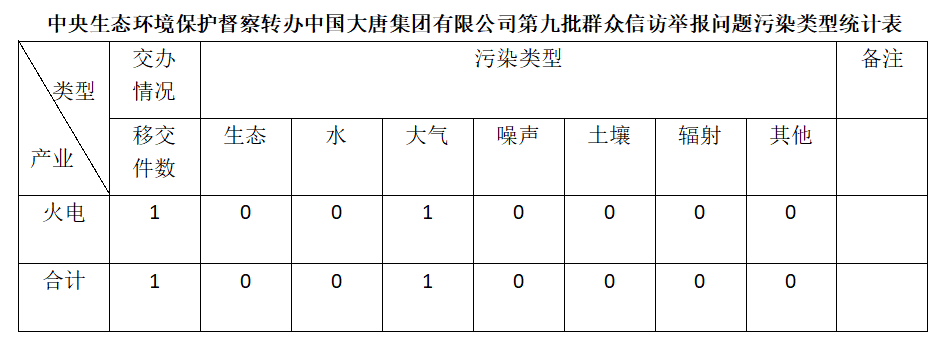 2025年6月12日,中央第七生態環境保護督察組向中國大唐集團有限公司移交第九批群眾信訪舉報件,共計1件,為來電舉報,涉及大氣問題1個。所有舉報件辦理工作已第一時間進入調查核實辦理程序,辦理情況將按照相關要求反饋督察組,并及時向社會公開。